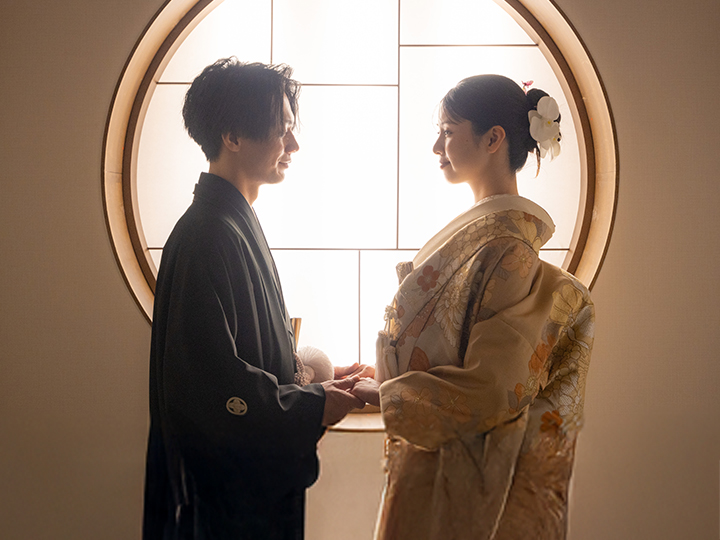 日本家屋特有の静寂な雰囲気を表現できる丸窓の背景も人気スポットのひとつ。